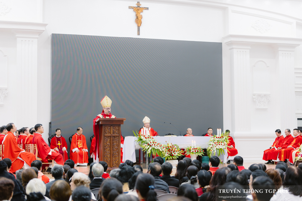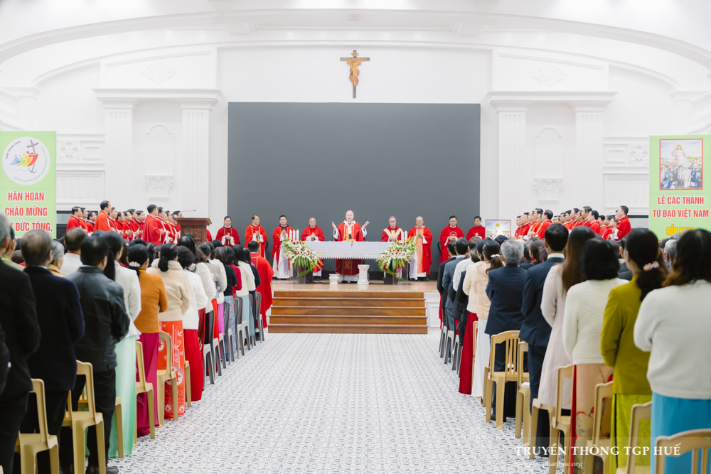 Lúc 09g00, Thánh lễ kính trọng thể các Thánh Tử Đạo Việt Nam, bổn mạng HĐMV TGP Huế, do Đức Cha Giuse Đặng Đức Ngân – Tổng Giám mục (TGM) TGP Huế chủ tế. Cùng đồng tế, có Đức Cha Giuse Nguyễn Chí Linh và Đức Cha Phanxicô Xaviê Lê Văn Hồng – Nguyên TGM TGP Huế, Cha Barnaba Trần Đình Phục – Tổng Đại diện, Cha Đaminh Phan Hưng – Đại diện Giám Mục và hơn 70 linh mục trong TGP.