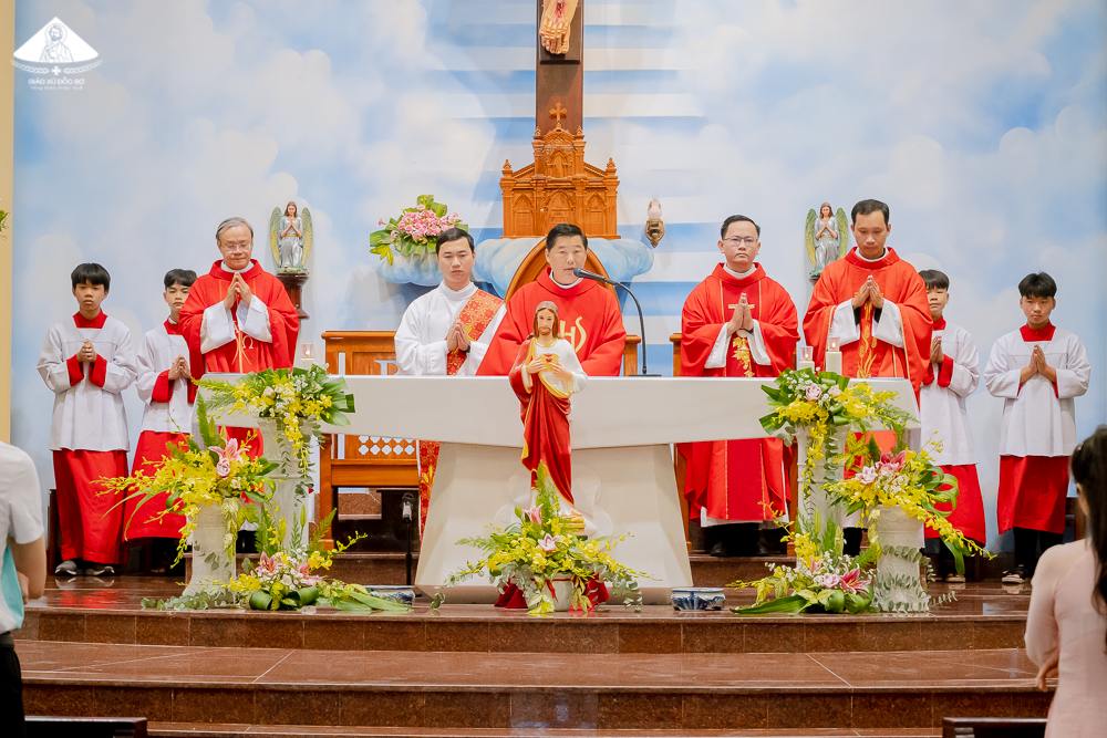 Thánh lễ trọng kính Thánh Tâm Chúa Giêsu được cử hành lúc 19g00, do Cha Phêrô Nguyễn Vũ – Quản xứ Đốc Sơ chủ tế; cùng đồng tế có Cha Giuse Nguyễn Thanh Tùng – Phó xứ; Cha Nicôla Đinh Trung Tâm, OSB; Cha Gregorio Trần Văn Tuấn, OSB. Đông đảo các Gia trưởng cùng cộng đoàn Giáo xứ sốt sắng tham dự.
