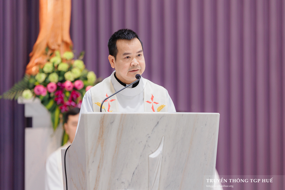 Liền sau đó là Thánh lễ với ý nguyện xin ơn thánh hoá các Linh mục, do Đức Cha Đaminh Hoàng Minh Tiến chủ tế. Đồng tế với Đức Cha Đaminh có Đức Tổng Giám mục (TGM) Giuse Đặng Đức Ngân, Đức Nguyên TGM Phanxicô Xaviê Lê Văn Hồng, Cha Tổng Đại diện Barnaba Trần Đình Phục, Cha Đại diện Giám mục Đaminh Phan Hưng, quý Đức Ông cùng toàn thể Linh mục đoàn tham dự kỳ tĩnh tâm; quý Thầy Phó tế hiệp thông tham dự. Trong Thánh lễ, Cha Tổng Đại diện Barnaba chia sẻ Lời Chúa cho cộng đoàn.