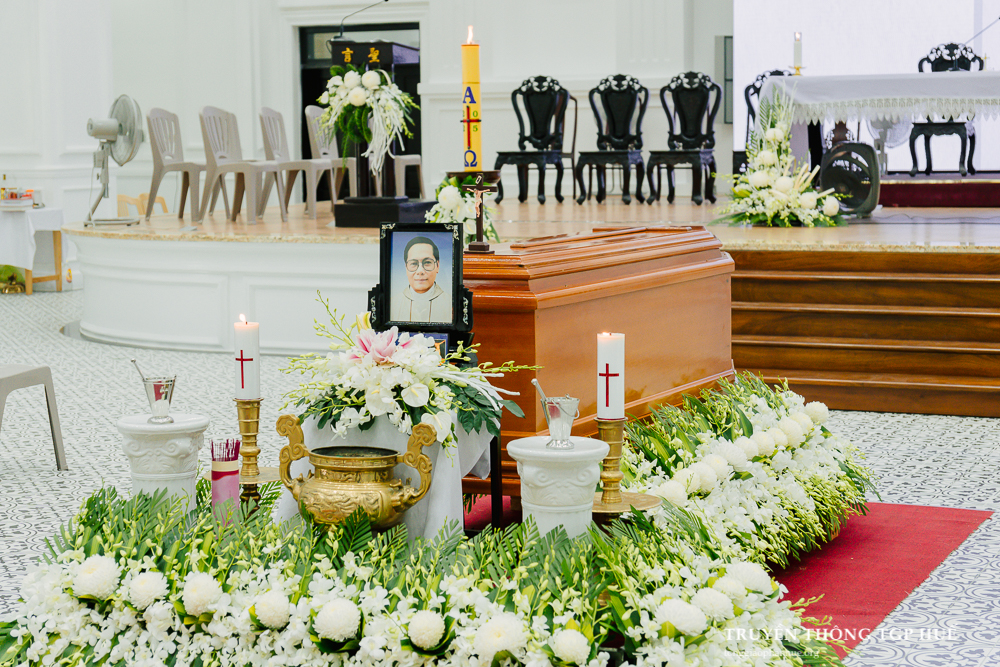 Sau các lời nguyện tín hữu, Cha Đaminh chủ sự làm phép thi hài, quan tài, khăn tang và đội tẫn liệm tiến hành đưa thi hài cố Linh mục Anrê nhập quan.