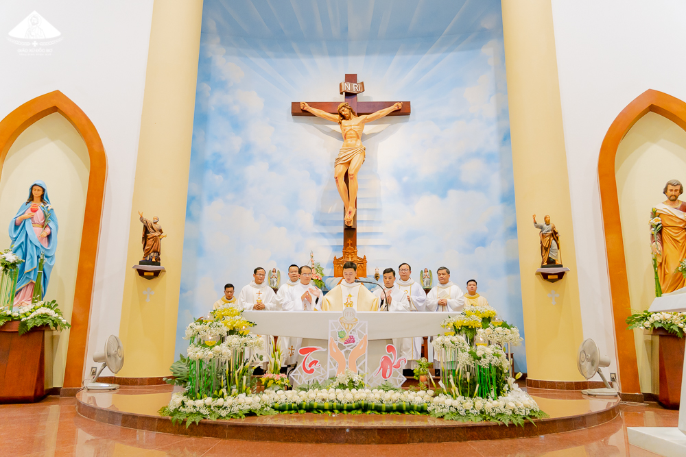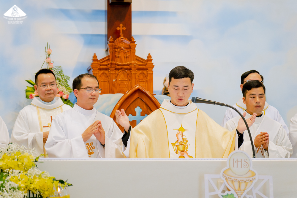 Thánh lễ được cử hành lúc 16g00 do chính Tân Linh mục Phêrô Nguyễn Sơn Tùng chủ tế, cùng đồng tế còn có sự hiện diện quý báu của Cha Barnaba Trần Đình Phục – Đại diện tư pháp, Chưởng ấn, Thư ký và Chánh văn phòng Tòa TGM TGP Huế, Cha Giuse Phan Văn Quyền – Quyền Hạt trưởng Hạt Thành Phố, Cha Philipphê Hoàng Linh – Tổng Thư ký Hội đồng Mục vụ TGP Huế, Cha Giuse Vũ Quốc Bình – Hạt trưởng Hạt Đăk Hà, Quản xứ Ling La thuộc Giáo Phận Kontum và cũng là Linh mục Nghĩa phụ của Tân Linh mục Phêrô, ngoài ra còn có quý Cha trong TGP, quý Cha đồng hương, quý Cha mới cùng lớp với Tân Linh mục. Hiệp dâng Thánh lễ còn có quý Thầy Phó tế, quý Đại Chủng sinh, quý Tu sĩ nam nữ, quý thân nhân – ân nhân, quý khách và toàn thể dân Chúa Giáo xứ Đốc Sơ.