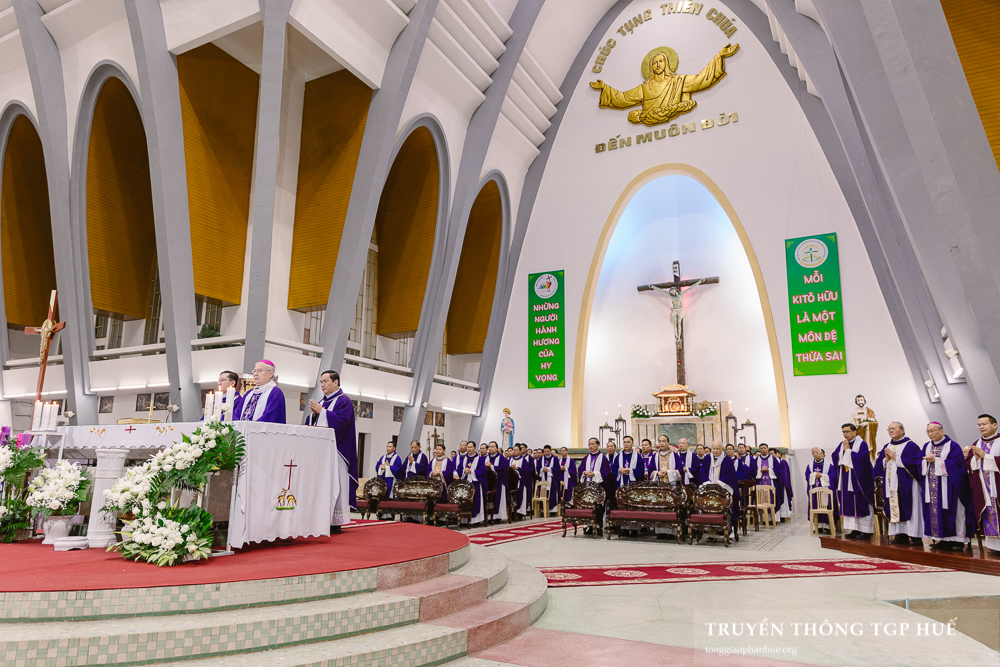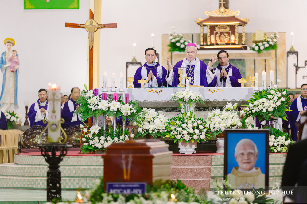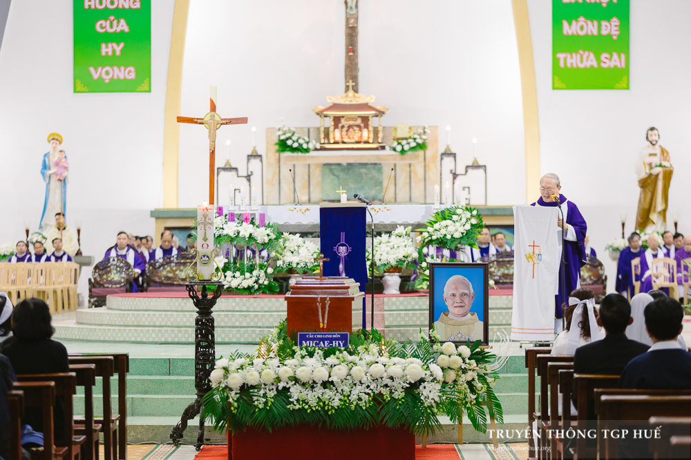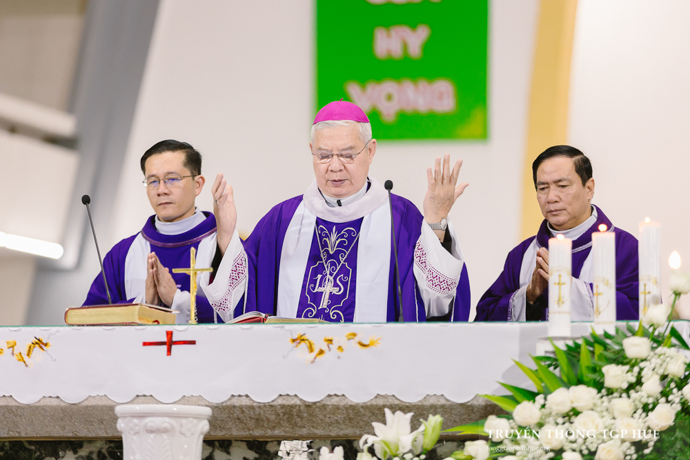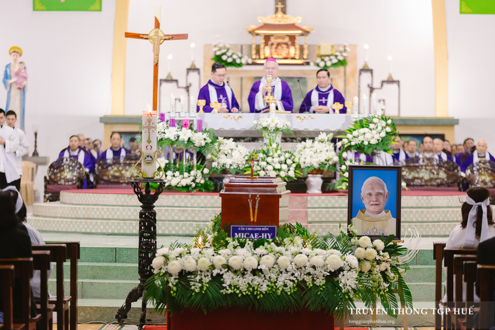 Thánh lễ được Đức TGM Giuse cử hành tại Nhà thờ Chính tòa Phủ Cam lúc 05g00 sáng thứ Tư, ngày 17.12.2025. Đồng tế trong Thánh lễ có Đức Cha Phanxicô Xaviê Lê Văn Hồng – Nguyên TGM TGP Huế, Cha Barnaba Trần Đình Phục – Tổng Đại diện, Cha Đaminh Phan Hưng – Đại diện Giám mục, Đức Ông Antôn Dương Quỳnh, Đức Ông Giuse Nguyễn Văn Chánh, Đức Ông Giêrônimô Nguyễn Ngọc Hàm, quý Cha Hạt trưởng, quý Cha Bề trên Dòng, Linh mục đoàn Giáo phận, quý Cha Dòng và quý Cha ngoài Giáo phận. Sốt sắng hiệp dâng Thánh lễ có quý Tu sĩ nam nữ, quý Đại Chủng sinh, Chủng sinh Tiền Chủng viện, thân bằng quyến thuộc của Cố Linh mục Micae-Hy và đông đảo anh chị em giáo dân.