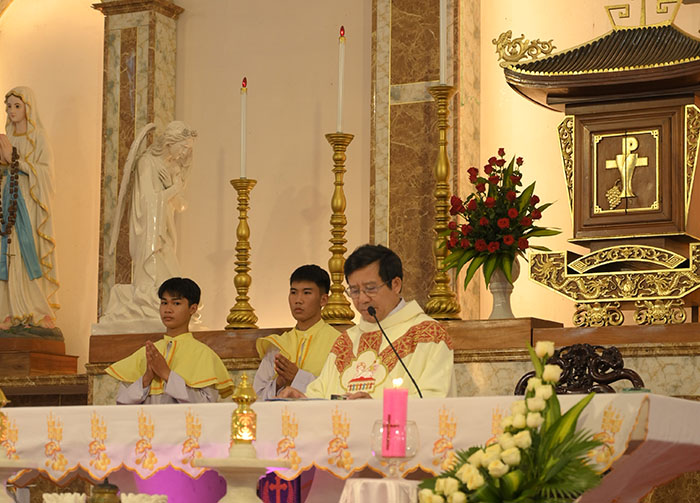 Mở đầu Thánh lễ, Cha Quản xứ Anrê mời gọi: “Anh chị em thân mến! Hôm nay chúng ta cùng với Hội Thánh mừng kính trọng thể lễ Mình Máu Thánh Chúa Kitô. Trong Bí Tích Thánh Thể, chúng ta được đón nhận chính Đức Giêsu là suối nguồn của mọi ân phúc. Nên giờ đây Chúa Giêsu mời gọi chúng ta đến để tham dự bữa tiệc thánh trong Thánh lễ này: “Tất cả các con hãy nhận lấy mà ăn, vì này là Mình Thầy. Tất cả các con hãy nhận lấy mà uống, vì này là Máu Thầy, các con hãy làm việc này mà nhớ đến Thầy”.