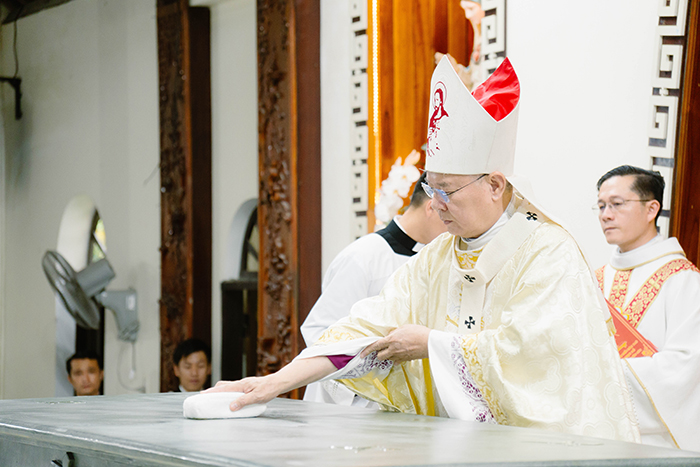 Lời nguyện cùng với việc xức dầu Thánh là phần chính yếu của nghi thức Cung hiến bàn thờ. Đức TGM Giuse long trọng dâng lời nguyện thánh hoá, đổ dầu Thánh ở 5 nơi trên bàn thờ. Kế đó là nghi thức xông hương bàn thờ, trải khăn bàn thờ và thắp sáng bàn thờ.