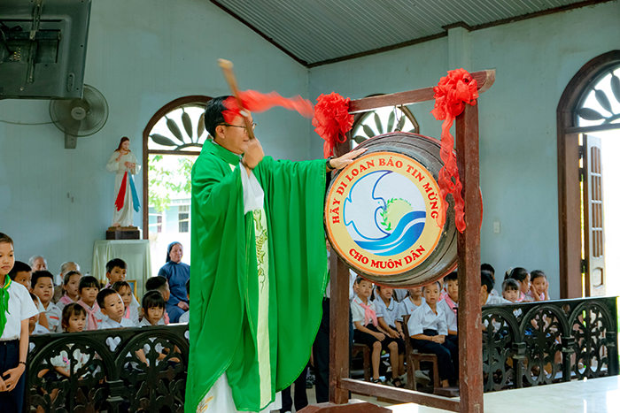 Tiếp theo đó, Cha Quản xứ đã đánh những hồi trống vang lên, chính thức khai giảng năm học Giáo lý 2025 – 2026 với chủ đề “Cùng Chúa Giêsu, chúng ta bước đi trong hy vọng”.