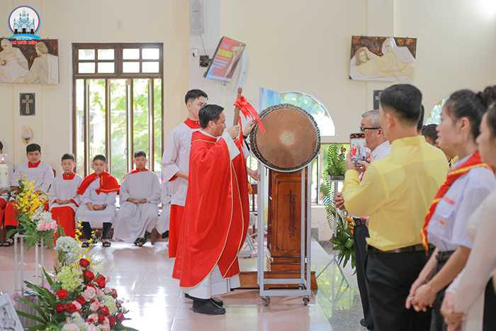Cha Phó xứ Matthêu khai mở hồi trống và tuyên bố khai giảng năm học Giáo lý 2025 – 2026. Tất cả Giáo lý viên và các em thiếu nhi hân hoan vỗ tay chào mừng năm học mới.