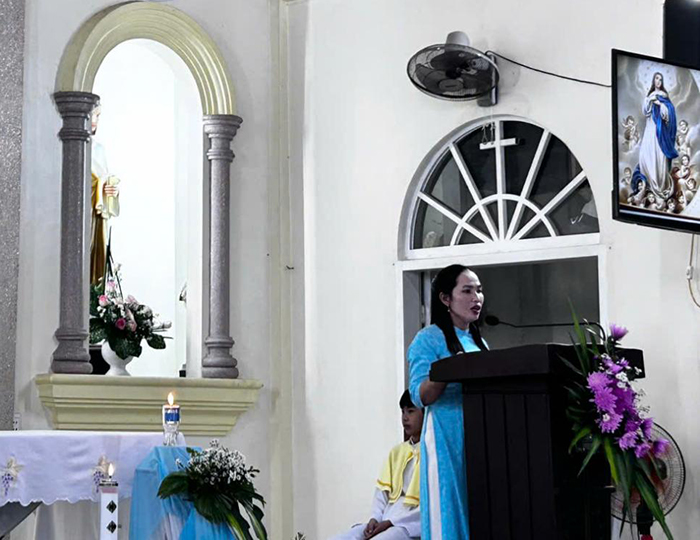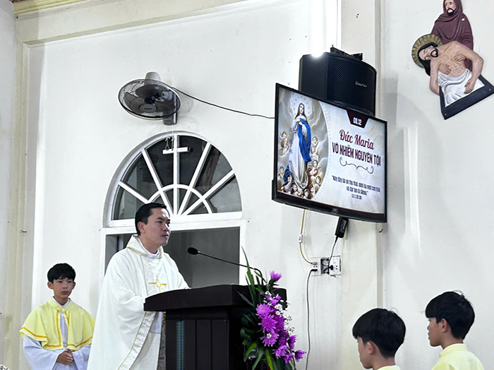Trong phần chia sẻ Lời Chúa, Cha Quản xứ đã quảng diễn về đặc ân “Vô Nhiễm Nguyên Tội” của Đức Mẹ:“Thay vì gọi Mẹ bằng tên Maria, Thiên Thần Gabriel lại gọi Mẹ bằng một tên khác, tên mà Mẹ có ở trước mặt Thiên Chúa. Thiên Thần gọi Mẹ là Đấng Đầy ân sủng. Nhờ được đầy ân phúc, Mẹ khác biệt với hết thảy mọi người. Mẹ là người duy nhất đã được ân sủng của Thiên Chúa làm cho trở nên vẹn tuyền, hoàn hảo”.