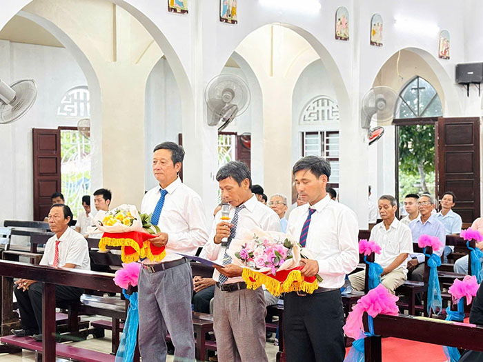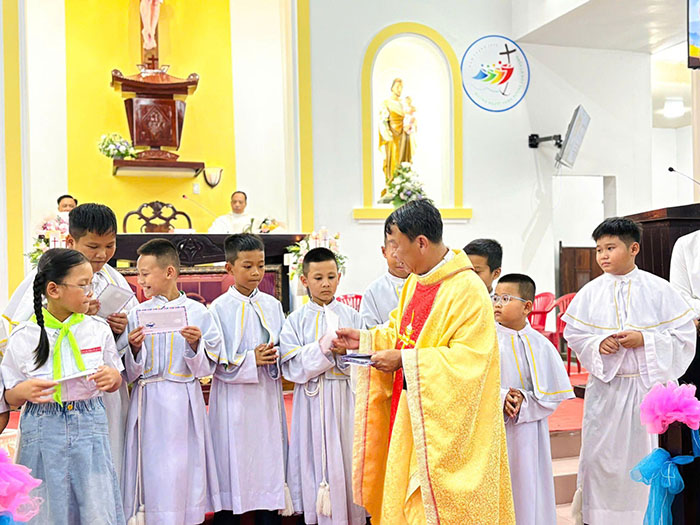 Cha Quản xứ gửi lời cảm ơn đến quý Cha, quý chị và quý quan khách đến tham dự Thánh Lễ hôm nay. Ngài trao gửi những phần quà nhỏ cho các em đã nhiệt thành tham gia các công việc phục vụ ở các giáo xứ. Món quà nhỏ nhưng sẽ là động lực thúc đẩy các em trong các công việc của cộng đoàn giáo sở.