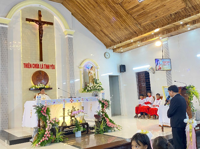 Đầu Thánh lễ, Cha Quản xứ chia sẻ niềm vui và chúc mừng bổn mạng giáo xứ, và những ai đã chọn Thánh nữ làm quan thầy bổn mạng. Đây là Thánh lễ bổn mạng đầu tiên của giáo xứ mà Cha Giuse cử hành với tư cách là quản xứ, để tạ ơn Thiên Chúa và cầu nguyện cho các bậc tiền nhân, ông bà, anh chị em trong Giáo xứ Truồi đã qua đời.