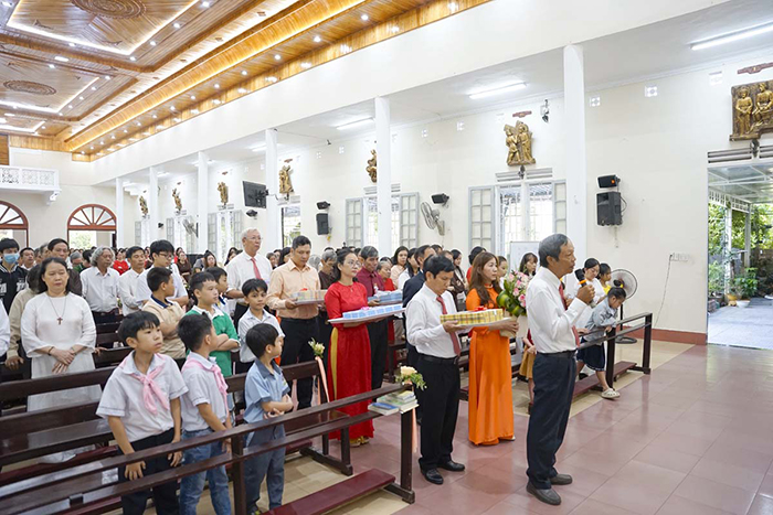 Mở đầu Thánh lễ, Cha Quản xứ mời gọi cộng đoàn cùng chung lời tạ ơn Thiên Chúa vì muôn hồng ân cao vời Người đã thương ban cho chính Cha và cho cộng đoàn suốt những năm tháng qua. Và trong bài chia sẻ Tin Mừng, Cha Quản xứ đã kêu mời cộng đoàn biết tìm được ý Chúa nhắn gửi cho chúng ta là “con cái ánh sáng” biết khôn khéo dùng tiền của để tạo bạn bè, biết giúp đỡ những người nghèo bên cạnh mình.