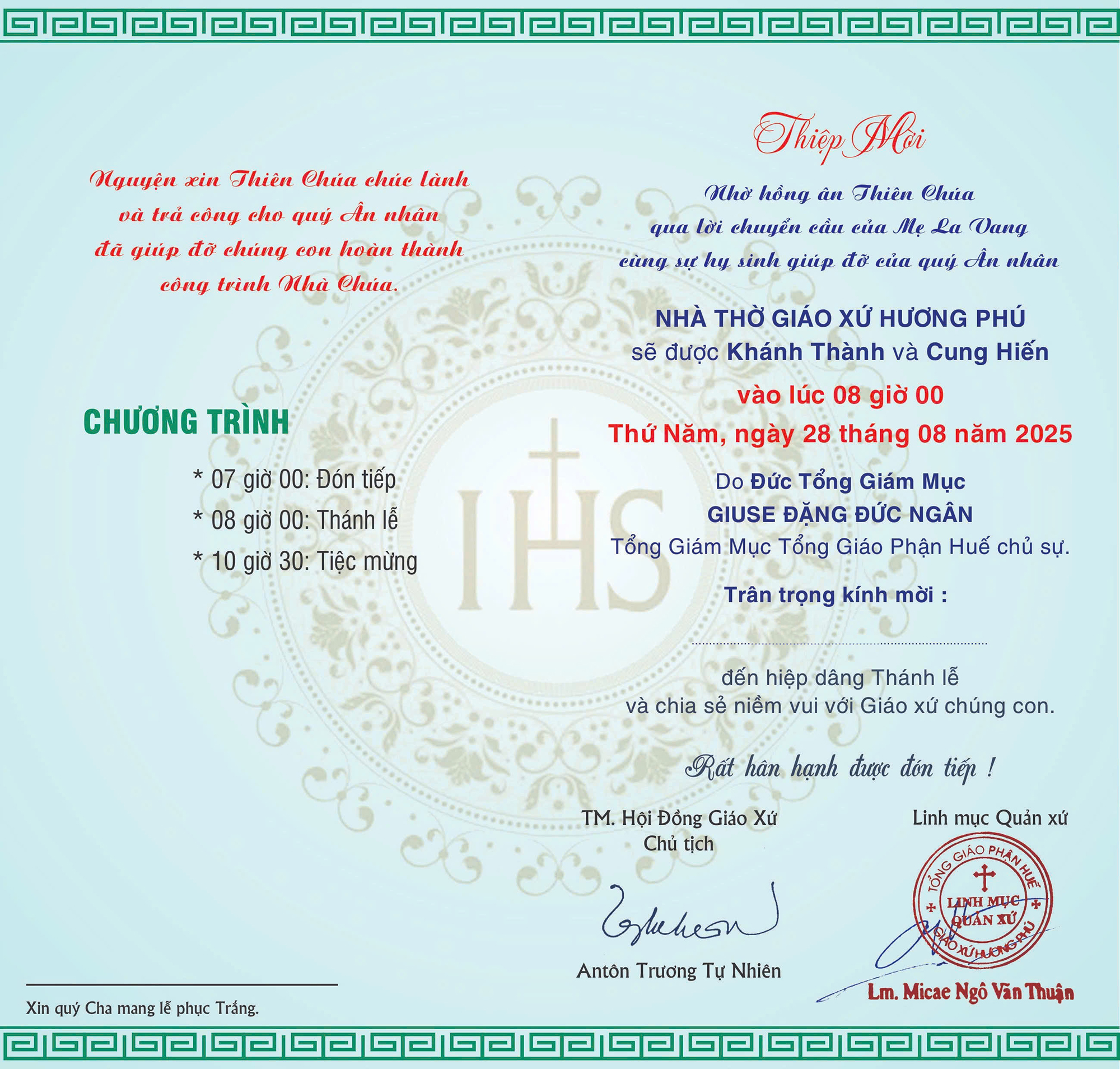 Thiệp báo: Thánh lễ Khánh thành và Cung hiến Nhà thờ Giáo xứ Hương Phú (Nam Đông)