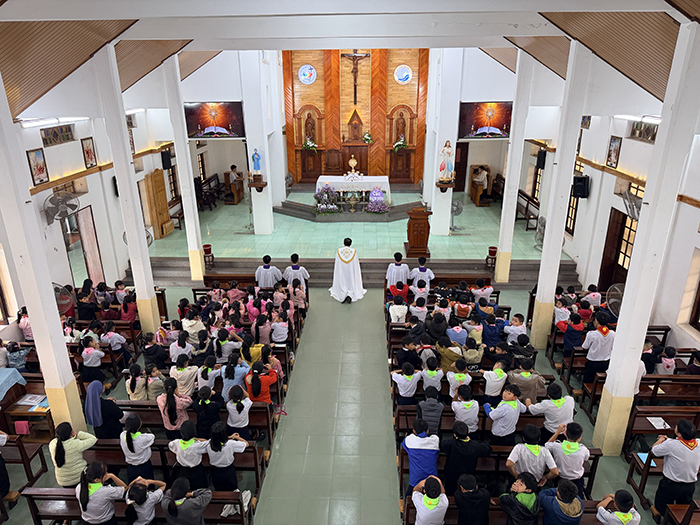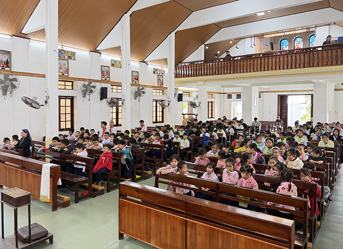 Ngay từ rất sớm, các em thiếu nhi trong đồng phục nghiêm trang đã tập trung trước nhà thờ, tiến vào trong sự hướng dẫn của quý anh chị Huynh Trưởng. Không khí Mùa Vọng được thể hiện rõ rệt qua sắc tím phụng vụ, vòng hoa Advent và ngọn nến đầu tiên được thắp sáng như lời mời gọi mọi Kitô hữu bước vào thời gian chờ đợi đầy hy vọng.