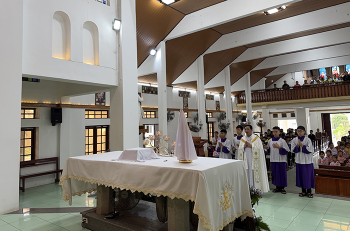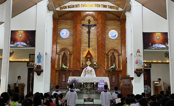 Khi Mình Thánh Chúa được đặt trên bàn thờ, toàn thể cộng đoàn chìm vào thinh lặng. Các em thiếu nhi, dù rất nhỏ tuổi, vẫn sốt sắng quỳ gối, hướng ánh mắt lên Chúa Giêsu Thánh Thể. Sự đơn sơ, trong trắng của tuổi thơ như làm cho bầu khí nhà thờ thêm linh thiêng và ấm áp.