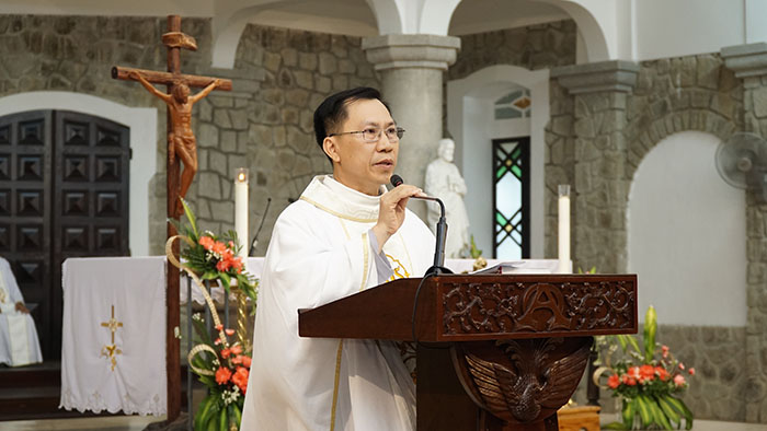 Trong phần giảng lễ, Cha Placido Phan Huy Hiếu chia sẻ: “Bí tích Thánh Thể là bí tích mà Chúa Giêsu lập ra để trao ban cho chúng ta như xưa Chúa đã dùng 5 chiếc bánh và 2 con cá để lo cho hơn 5000 người ăn vì đói khổ. Đối với các em thiếu nhi, ngày nay chúng con có đủ mọi thứ để nhận biết Chúa nhưng lòng yêu mến vẫn chưa thật sự lớn. Có gương chân phước Carlo Acutis cũng như các thiếu niên khác, ngài cũng đam mê tin học, cũng vui chơi bình thường nhưng ngài có lòng yêu mến Thánh Thể một cách đặc biệt và ngài đã nói một câu mà tất cả mọi người phải cần lưu tâm: ‘Thánh Thể như là đường cao tốc hướng dẫn con về thiên đàng’. Ước mong rằng khi khoác lên mình bộ đồng phục thiếu nhi với đủ màu khăn đẹp,các thiếu nhi cũng sẽ hướng tâm hồn về Thánh Thể đẹp như vậy”.