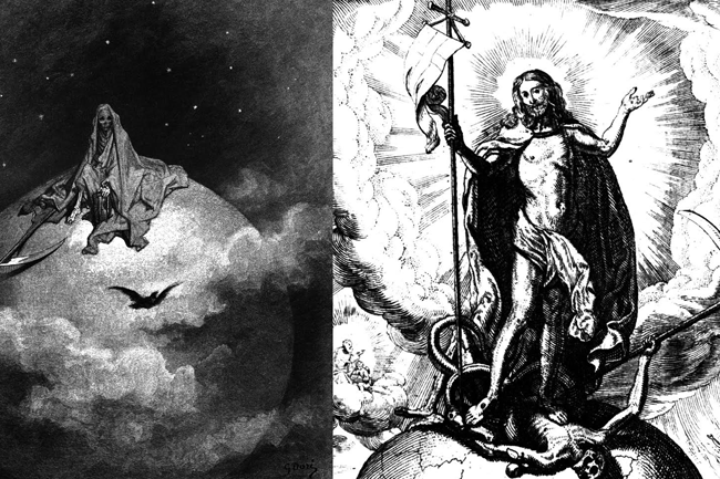 Cho đến một hôm Tử thần đã bất ngờ gục ngã ! Nơi ngực y, một gươm thần đã đâm thâu. Gươm thần Thập giá ! Trên mình y, một chiến thắng thần đã đạp mạnh. Chiến thắng thần mang tên Giêsu Kitô, khi Người sống lại sáng ngày Phục sinh, ra khỏi huyệt mộ cho Tử thần vào thế chỗ. Khi bước vào chỗ chôn vùi mình, y còn nghe sau lưng tràng cười khanh khách và giọng nói chế diễu: “Hỡi tử thần, đâu là chiến thắng của ngươi ? Hỡi tử thần, đâu là nọc độc của ngươi ?” (1Cr 15,55).