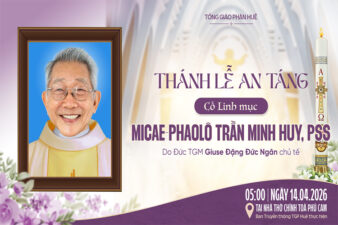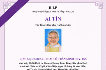 Cố Linh mục Micae – Phaolô Trần Minh Huy, PSS sinh ngày 01.06.1940 tại Huế, đã qua đời lúc 07g00 ngày Chúa Nhật 12.04.2026. Hưởng thọ: 86 tuổi, 54 năm Linh mục.