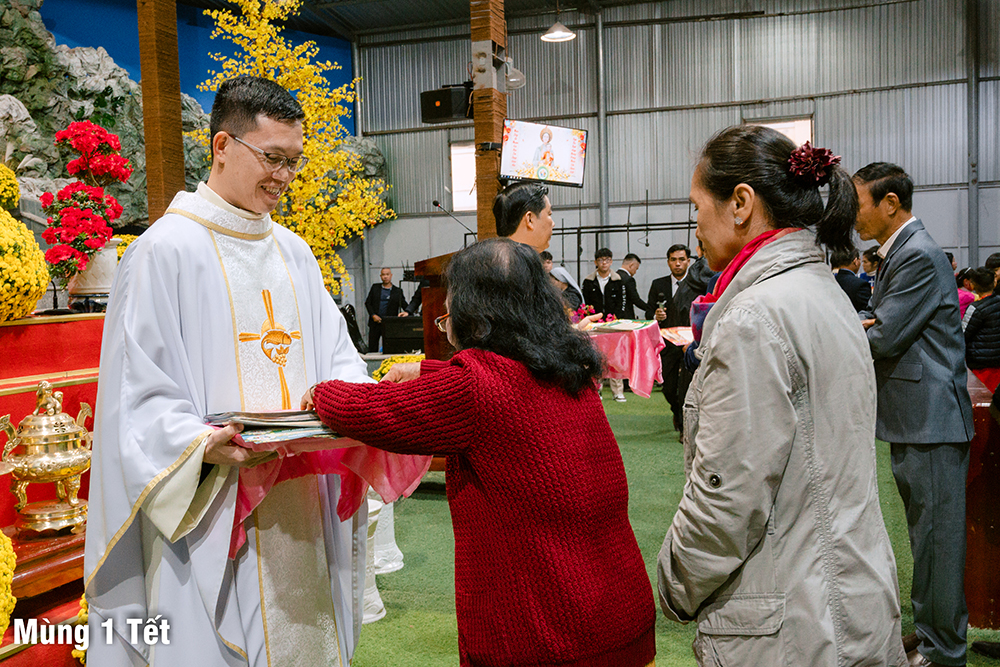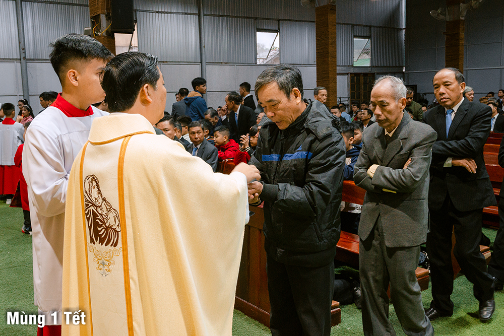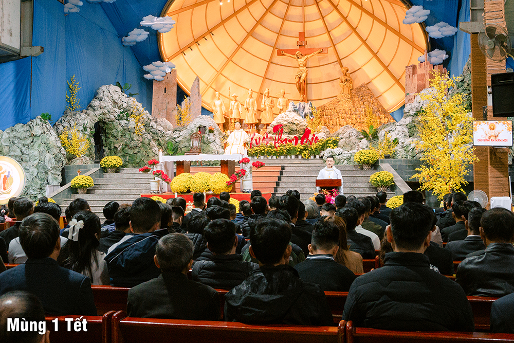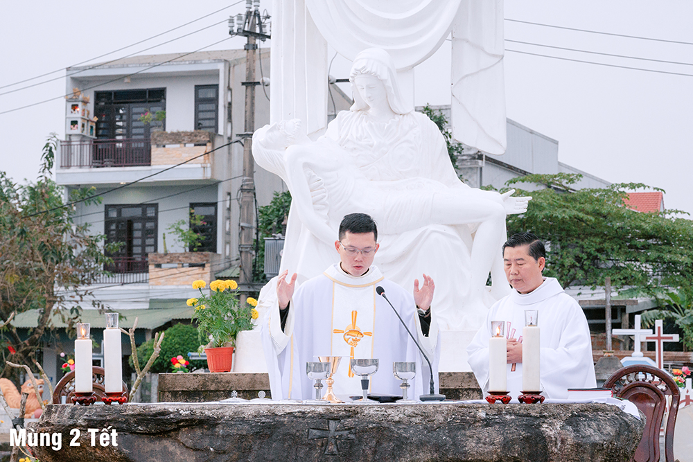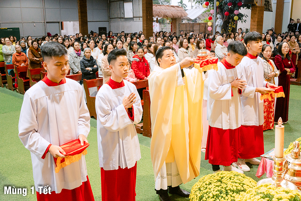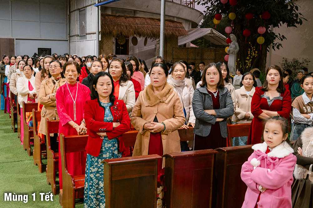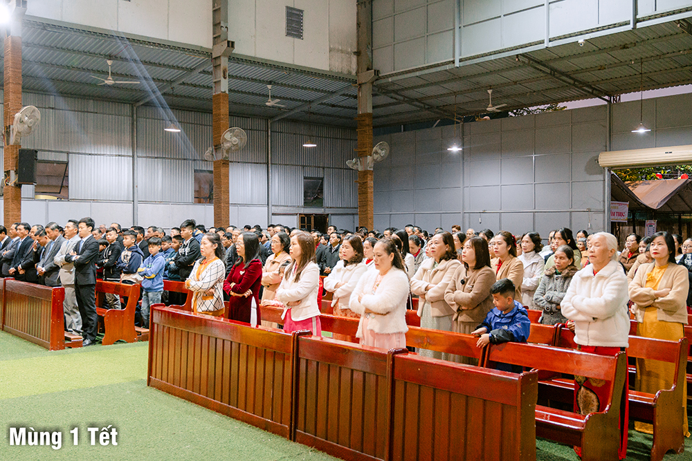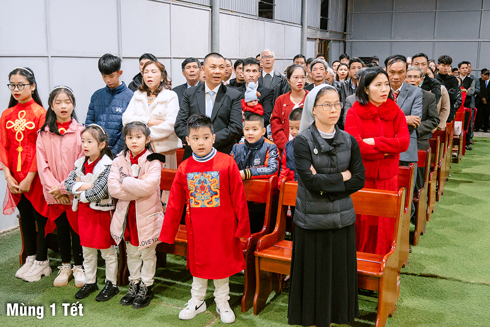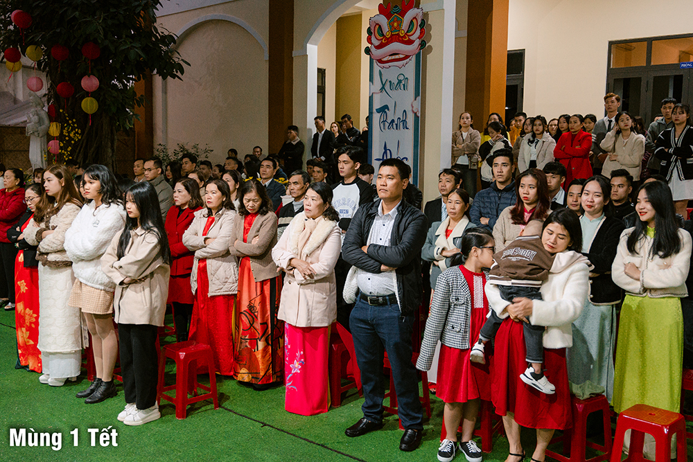 Dưới cơn mưa xuân và một chút se lạnh, ngày Mùng Một Tết, Thánh lễ cầu bình an cho năm mới được Cha Quản xứ Phêrô Nguyễn Vũ chủ tế, Cha Phó xứ Matthêu Trần Bảo Minh cùng đồng tế. Mọi thành phần trong Giáo xứ cùng hiệp dâng Thánh lễ cách sốt sắng và trang nghiêm. Lời cầu bình an đầu năm còn là lời nguyện xin Chúa thương đồng hành với công trình xây dựng Nhà thờ mới, với cuộc sống của mọi người, và đặc biệt biến cố mừng 350 năm lãnh nhận Đức tin trong năm nay.
