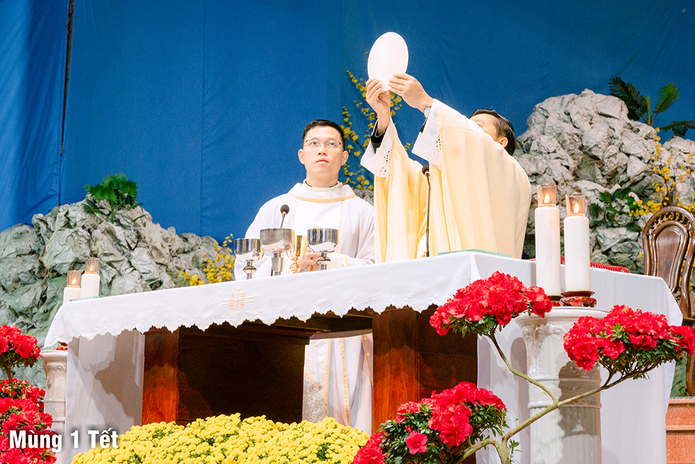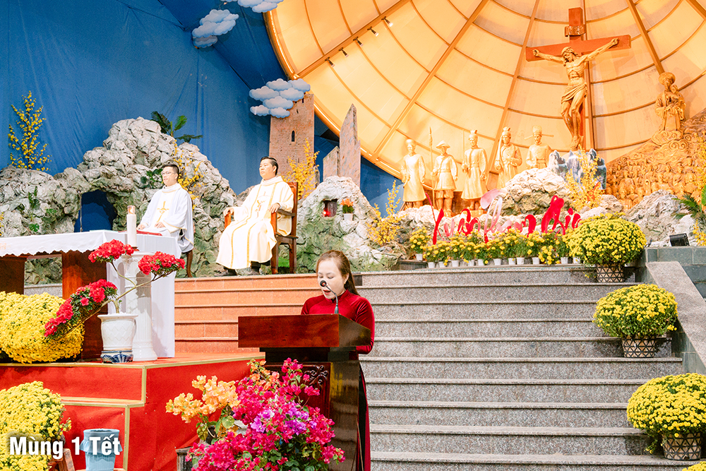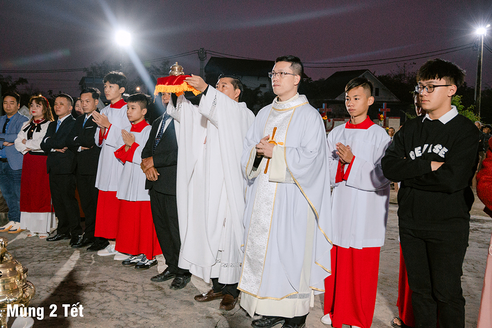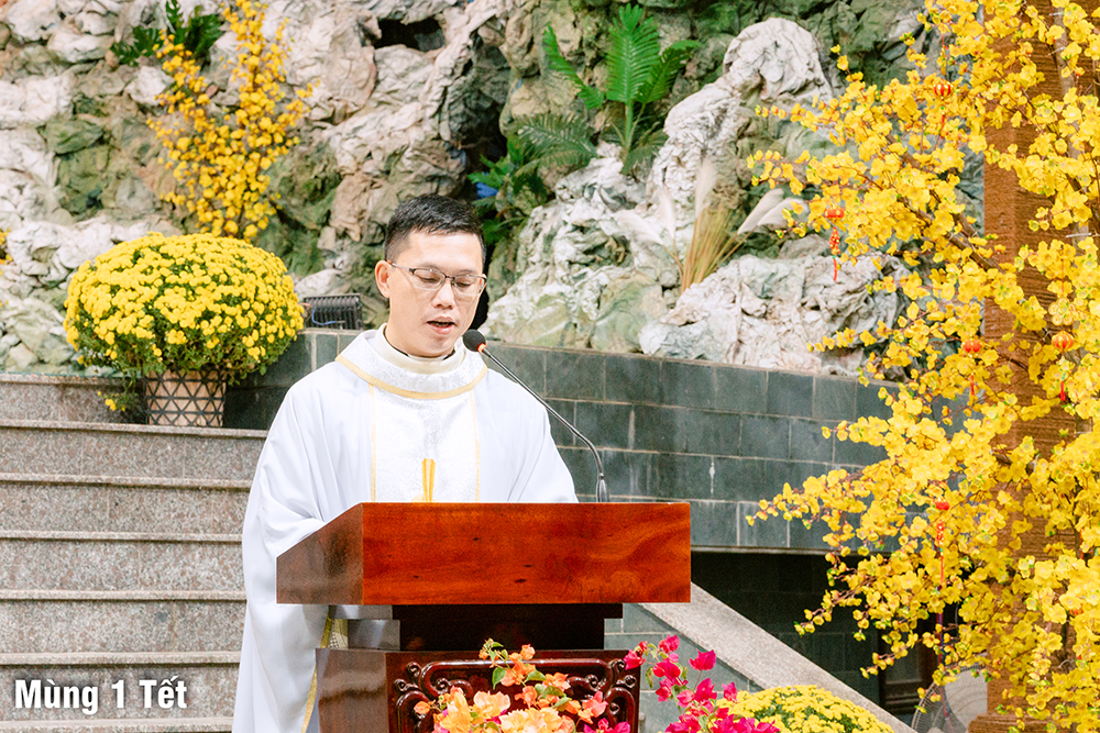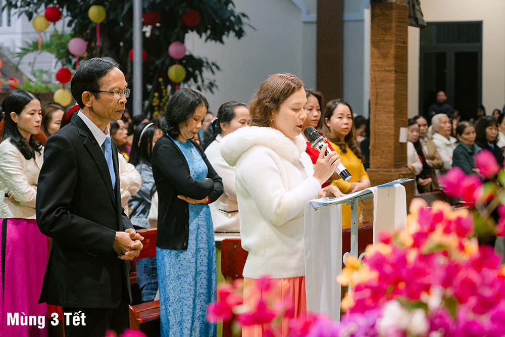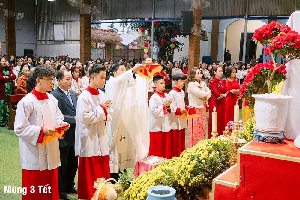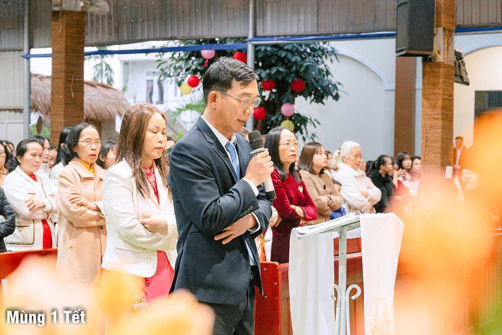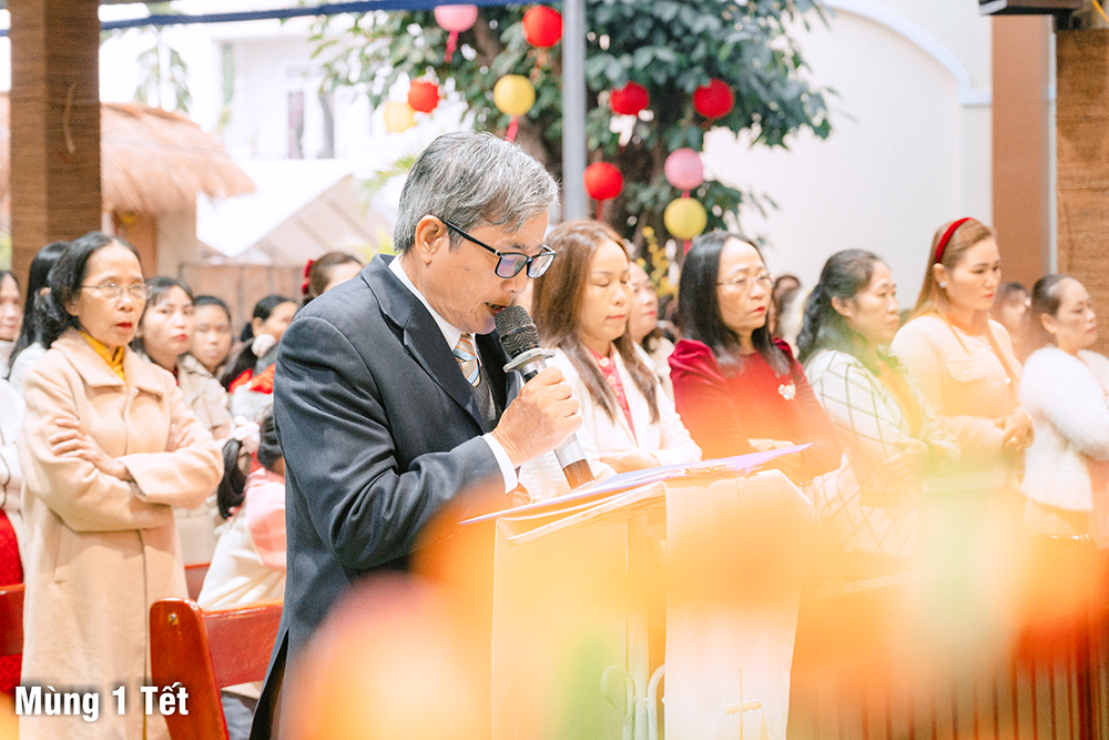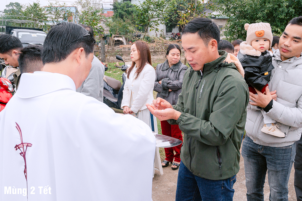 Dưới cơn mưa xuân và một chút se lạnh, ngày Mùng Một Tết, Thánh lễ cầu bình an cho năm mới được Cha Quản xứ Phêrô Nguyễn Vũ chủ tế, Cha Phó xứ Matthêu Trần Bảo Minh cùng đồng tế. Mọi thành phần trong Giáo xứ cùng hiệp dâng Thánh lễ cách sốt sắng và trang nghiêm. Lời cầu bình an đầu năm còn là lời nguyện xin Chúa thương đồng hành với công trình xây dựng Nhà thờ mới, với cuộc sống của mọi người, và đặc biệt biến cố mừng 350 năm lãnh nhận Đức tin trong năm nay.