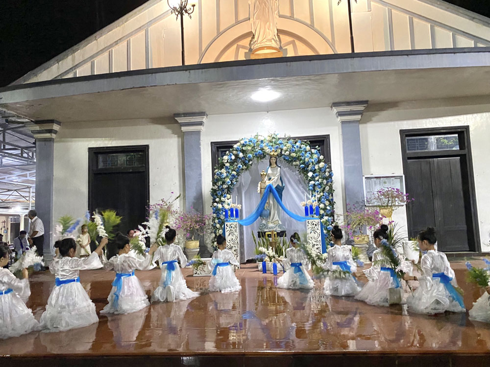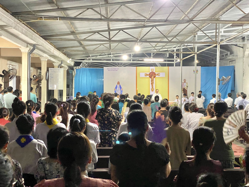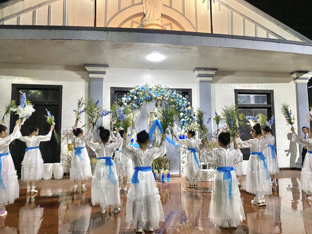 Mặc dầu thời tiết đổ mưa bất chợt nhưng cơn mưa tối nay chính là cơn mưa hồng ân, cơn mưa làm dịu đi tiết trời oi bức khó chịu, cơn mưa làm tràn trào thêm tâm tình con thảo. Cộng đoàn đã không quản ngại gió mưa, cùng hoà chung tâm tình với đội múa dâng lên Đức Mẹ những khúc hát ngợi khen, tung hô vị Nữ Vương Hội Thánh với những đoá hoa ngát hương.