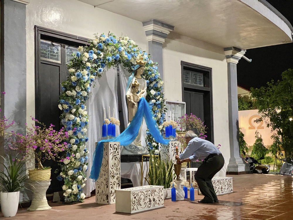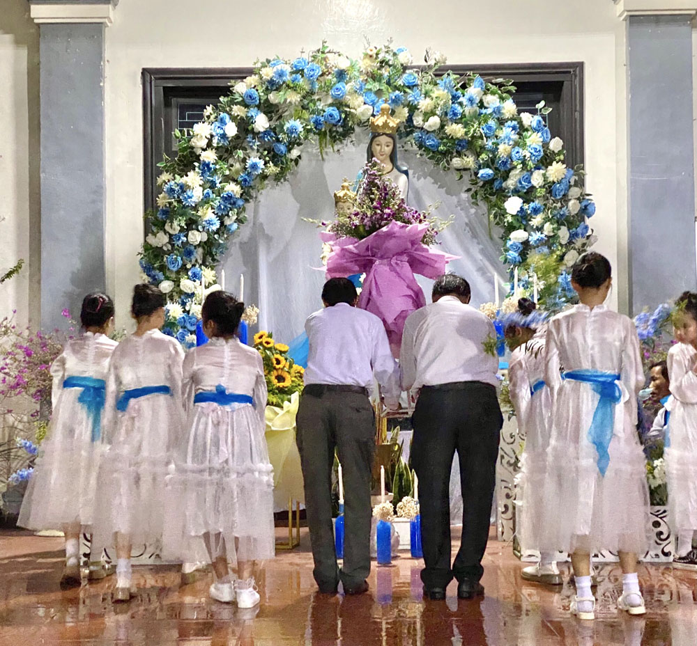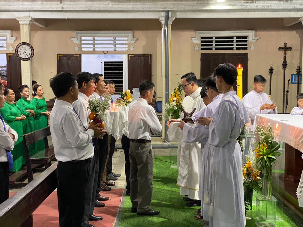 Mở đầu là nghi thức dâng hương của Cha Quản xứ và Ban Thường vụ. Nối tiếp là đoàn dâng hoa hoà trong tiếng hát ca khen. Những đoá hoa mang nhiều sắc màu được đại diện các đoàn thể trong Giáo xứ tiến dâng lên hiệp với những lời nguyện cầu cho Đức Thánh Cha, các Giám mục, Linh mục, Tu sĩ nam nữ, những mầm non Ơn gọi, các Thiếu nhi và Huynh trưởng, Gia trưởng, Hiền mẫu và bậc ông bà, các vị cao niên trong Giáo xứ.