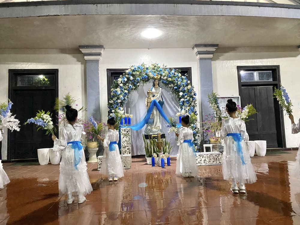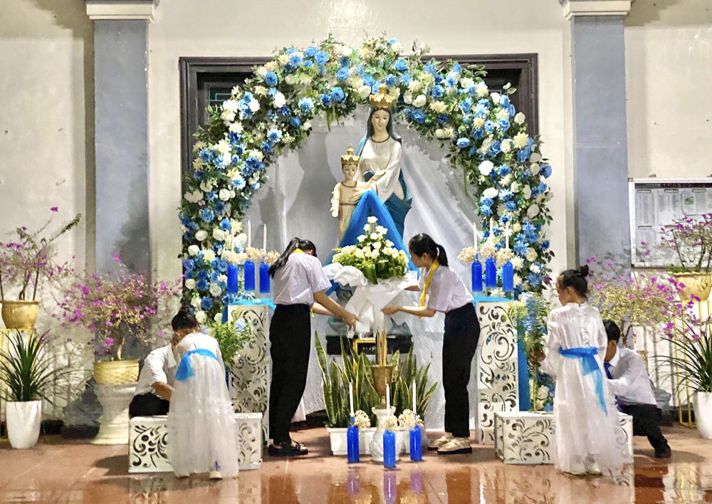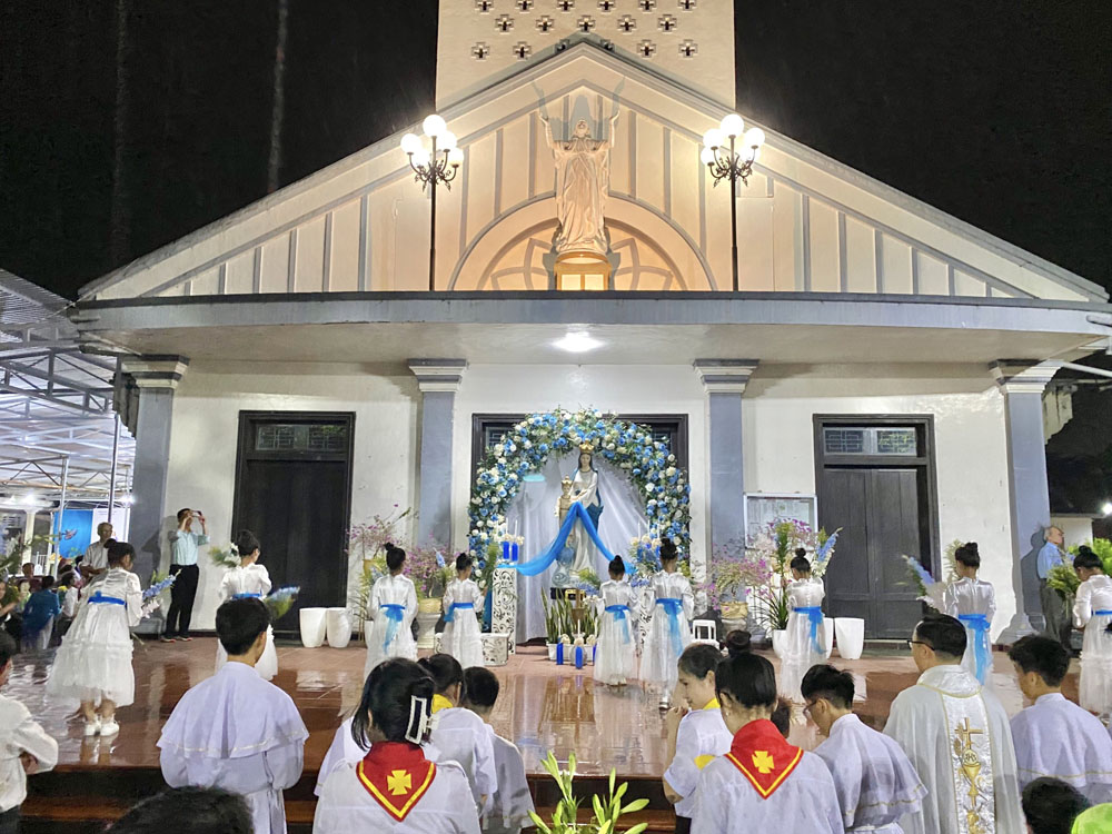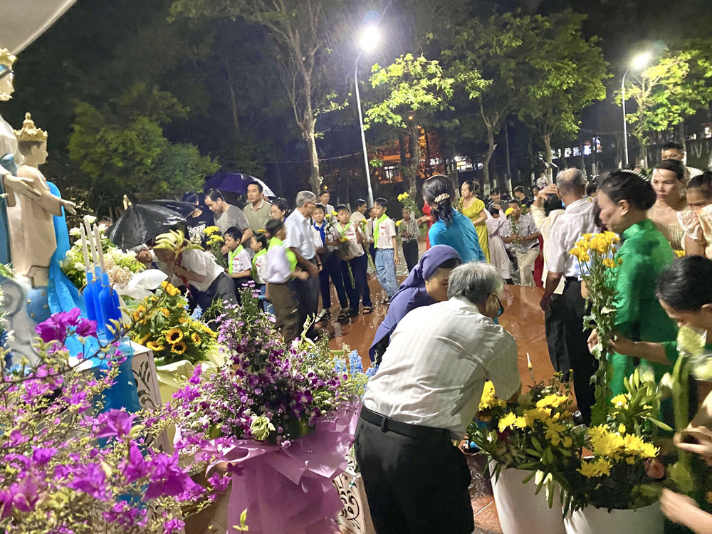 Sau Thánh lễ, đoàn con cái của Giáo xứ cùng nhau quy tụ trước Đài Mẹ, để cùng với các em trong đoàn dâng hoa khai mạc tháng Mẹ, dâng lên Mẹ những lời tạ ơn và lời nguyện xin tha thiết.