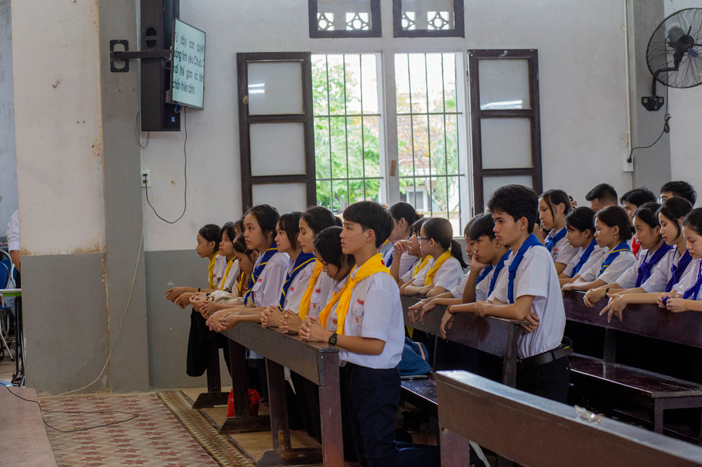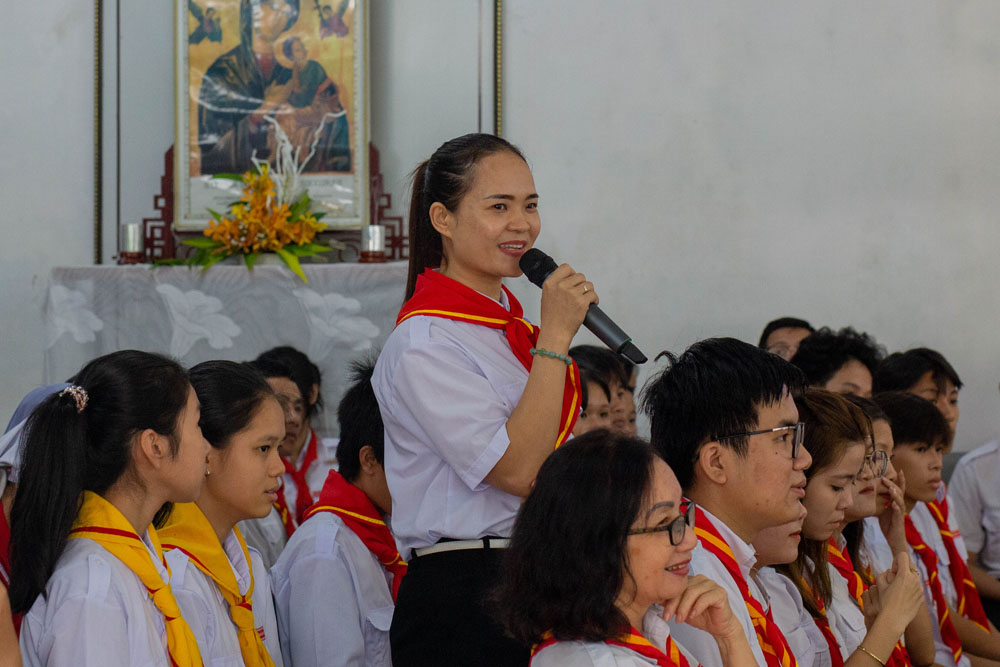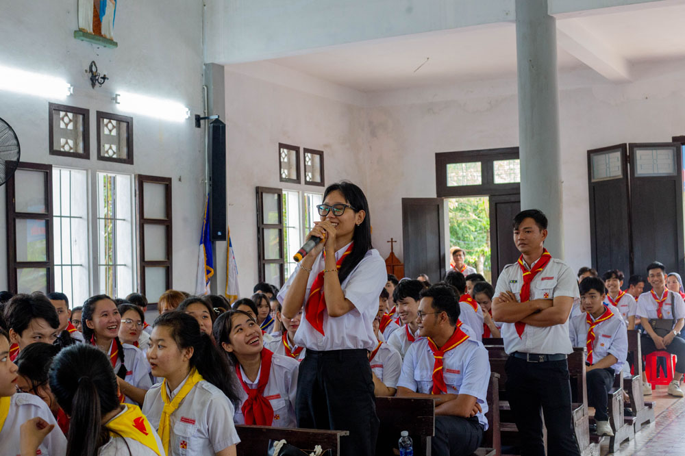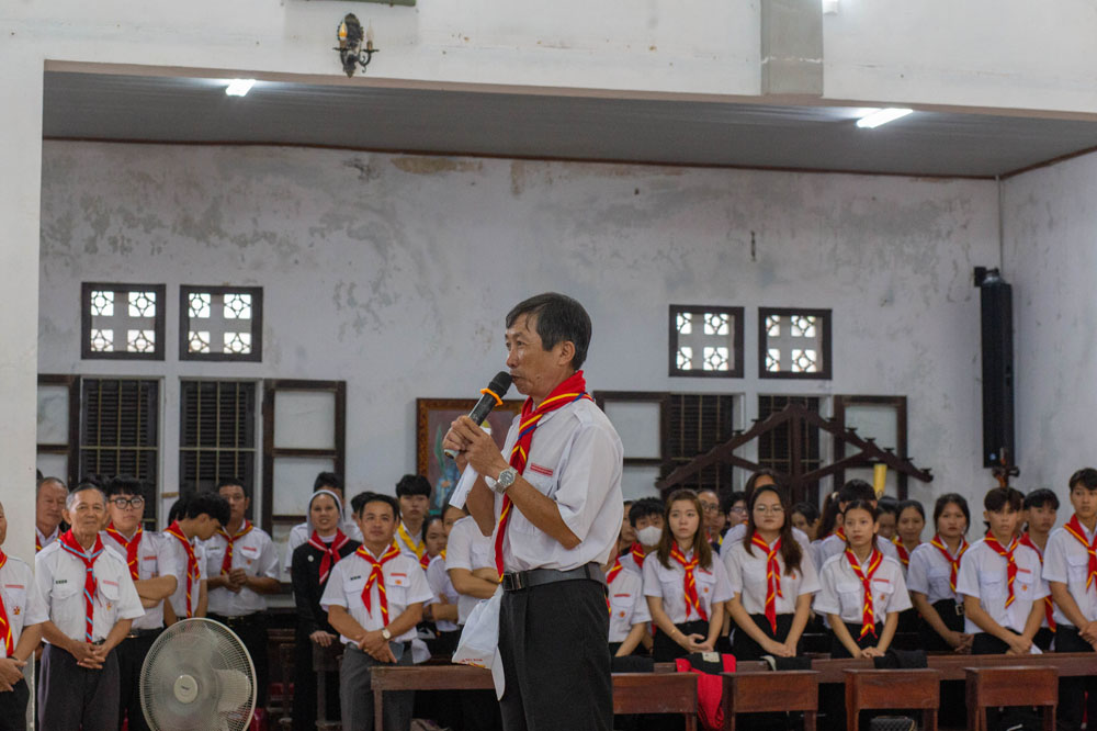 Dù thời tiết ngoài trời đang mưa, nhưng các tham dự viên đều cảm nhận bầu khí sôi động trong nhà thờ với những câu hỏi đố vui từ Cha Đaminh thuyết trình viên. Ngài đã gợi lên vai trò của người Huynh trưởng: là biết lắng nghe nhau, phân định các dấu chỉ thời đại, là sẵn sàng hoán cải và đổi mới, là từ bỏ thói tự mãn và an phận. Hình ảnh minh chứng sống động nhất là 117 vị Thánh Tử Đạo Việt Nam đã nêu ngương đời sống Hiệp Hành. Cha Đaminh mời gọi các huynh trưởng hãy bước đi cùng với Đức Kitô và đặt Ngài làm Người dẫn đường, sống tinh thần tử đạo, quên mình, luôn nghĩ đến tha nhân. Tất cả đều hướng tới một Hội Thánh: hiệp thông, tham gia, sứ vụ.