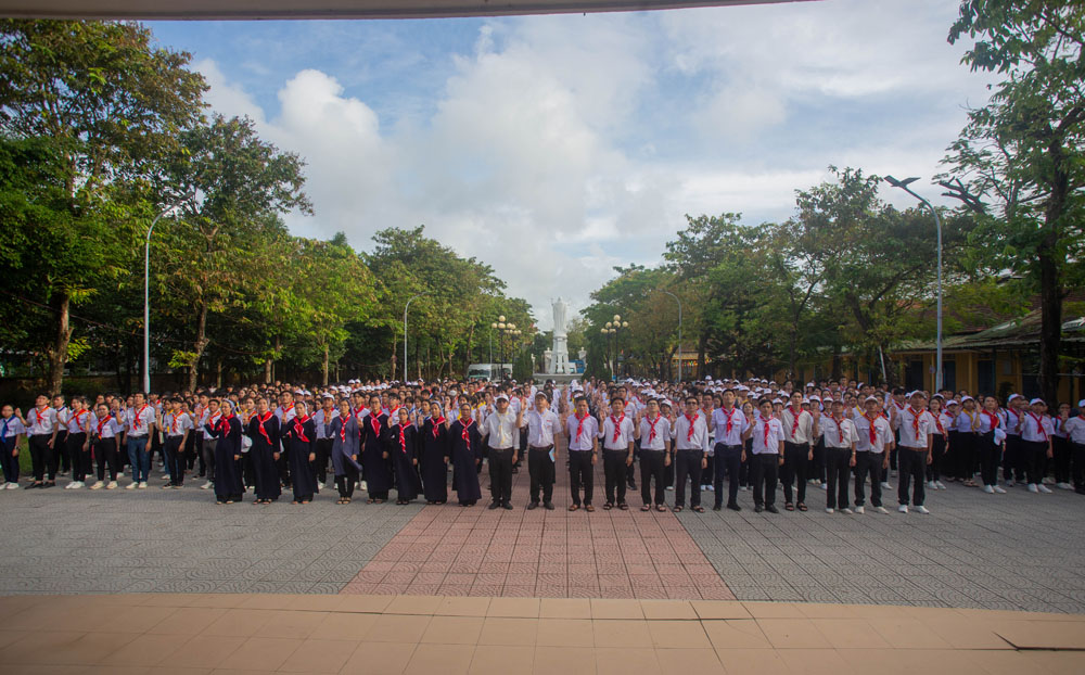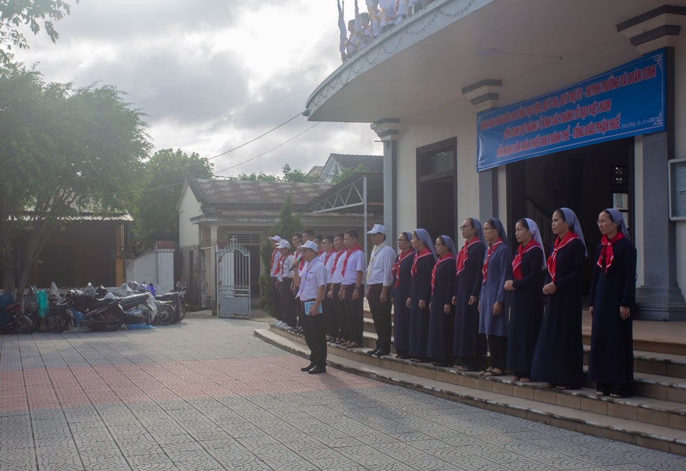 Nghi thức chào cờ dược diễn ra trang trọng cùng với câu chuyện dưới cờ của Cha Giuse, mời gọi tham dự viên hướng đến hình ảnh bất khuất của Thánh Anrê Trần Văn Trông và người mẹ can trường của ngài.