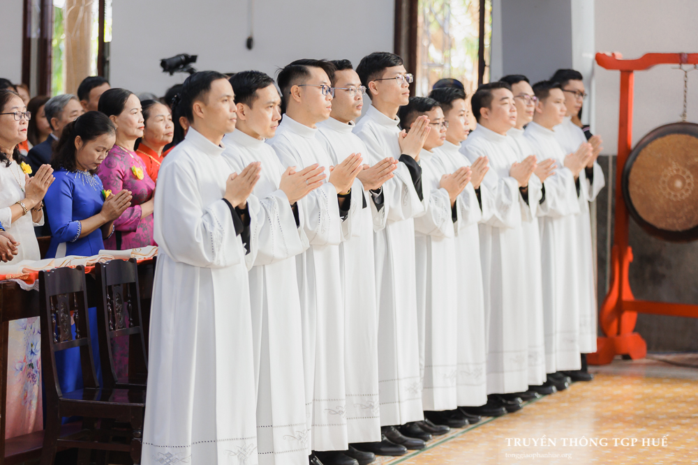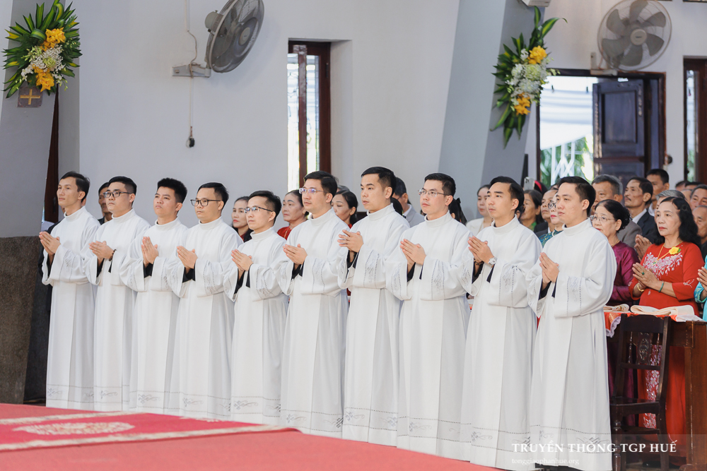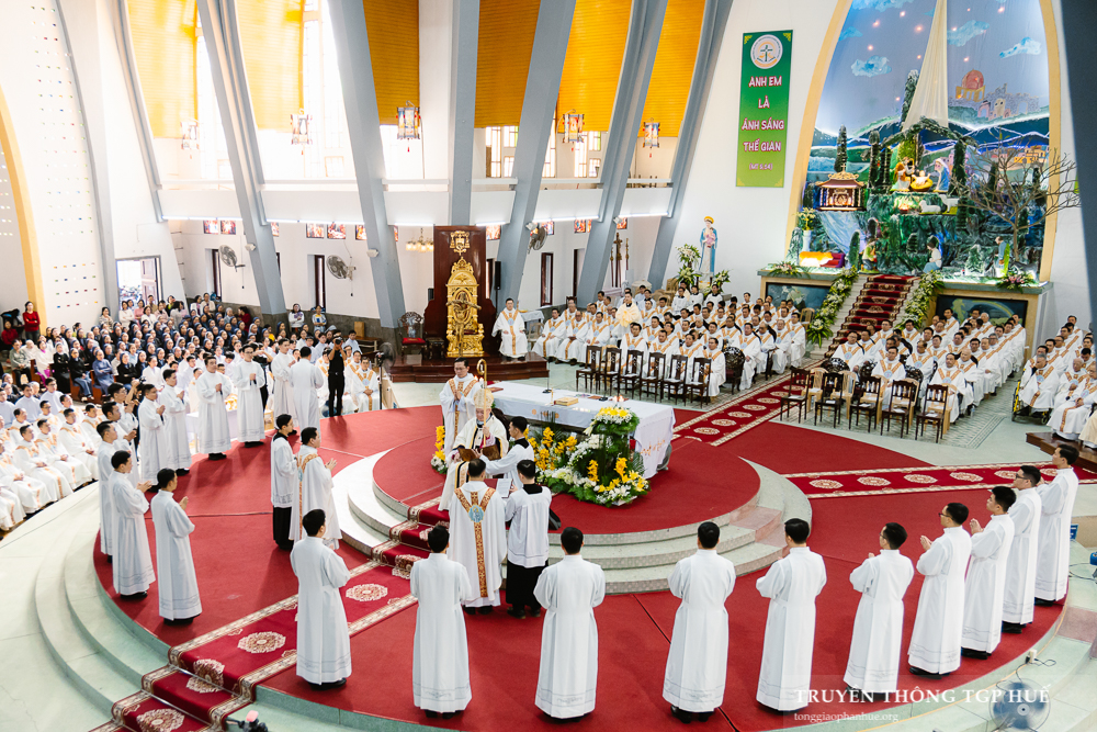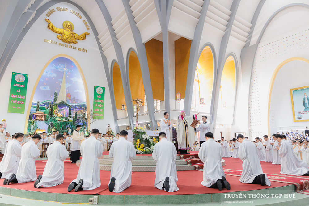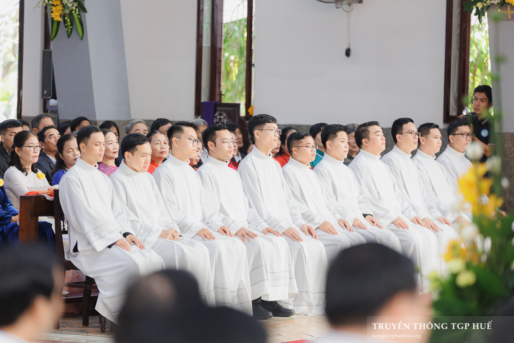 Thánh lễ được cử hành lúc 08g30 thứ Năm ngày đầu năm mới 01.01.2026 tại Nhà thờ Chính toà Phủ Cam. Với Thánh lễ này, Đức TGM Giuse đặt tay truyền chức Phó tế cho 10 Đại Chủng sinh TGP và 11 Tu sĩ Dòng Thánh Tâm Huế. Cùng đồng tế có Đức Cha Phanxicô Xaviê Lê Văn Hồng – Nguyên TGM TGP Huế, Cha Barnaba Trần Đình Phục – Tổng Đại diện, Cha Đaminh Phan Hưng – Đại diện Giám mục, quý Đức Ông, Cha Phêrô Nguyễn Thái Công – Bề trên Tổng quyền Dòng Thánh Tâm Huế cùng hơn 300 Linh mục và Phó tế trong và ngoài TGP. Hiệp dâng tham dự Thánh lễ có đông đảo quý Đại Chủng sinh, quý Tu sĩ nam nữ và cộng đoàn Dân Chúa đến từ nhiều Giáo phận.